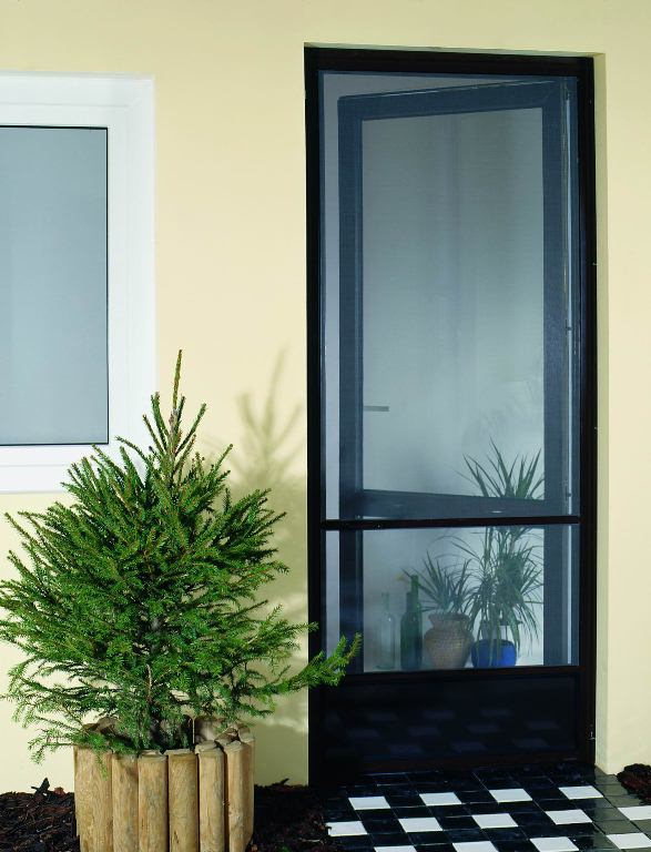 Komarnik vrata so sestavljena iz robustnejših alu profilov dimenzij 18×53 mm, v katere je z gumirano cevjo vpeta skoraj nevidna plastificirana mreža iz steklenih vlaken. Profili so barvani v rjavi, beli ali natur aluminij barvi.